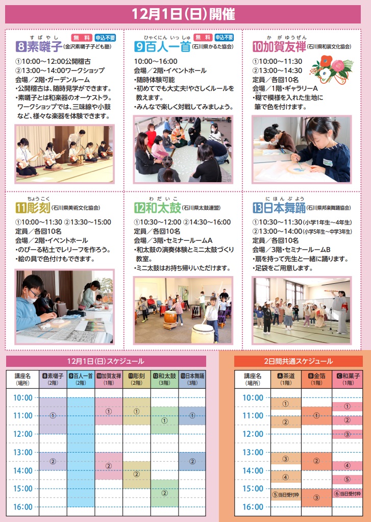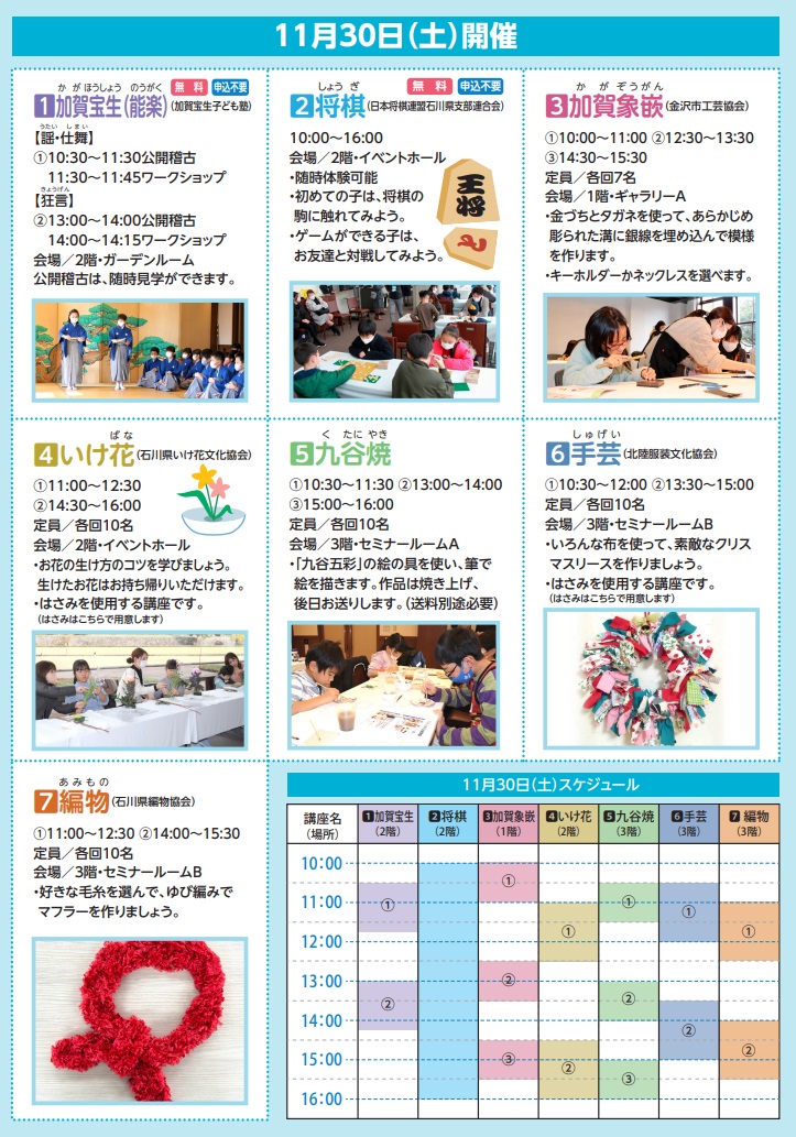 | 料金 | 文化体験講座 1講座につき1人300円(税込) 茶 道 1人一席 300円(税込) ※茶道は、親子2名1組でお申し込みください ※このほか、無料、申込不要の講座もあります |
